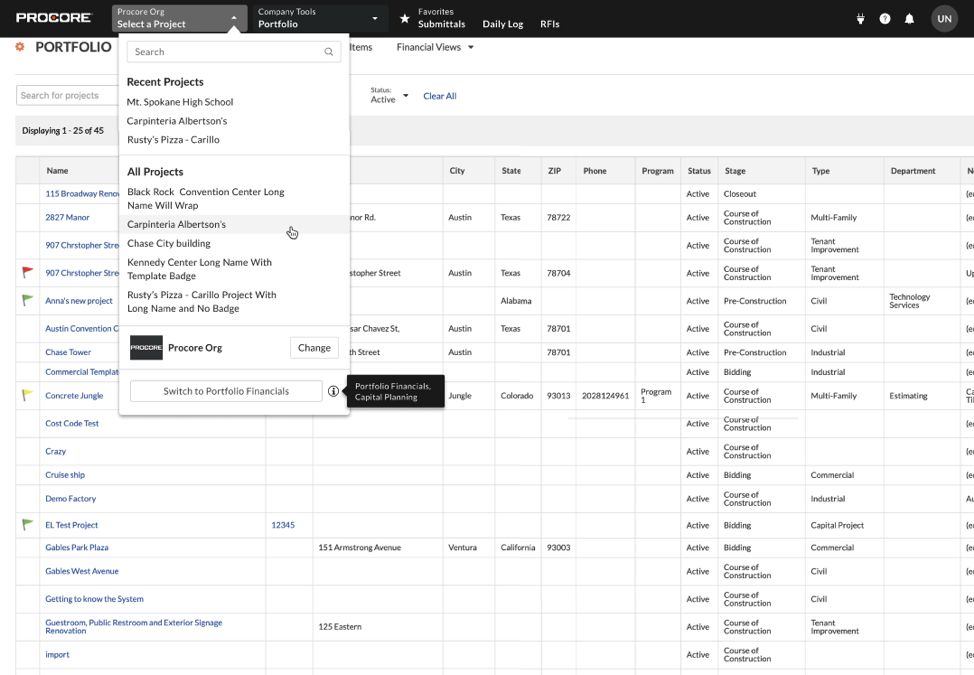 The new Toolkit Switcher offers easy and direct navigation between Portfolio Financials / Capital Planning tools (such as the Dashboard, Cost Tracker, and Bid Room) and other Procore tools (such as Drawings, Photos, and Inspections).