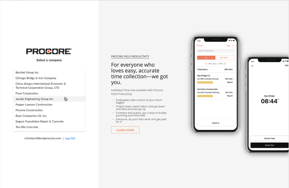 Additionally, users who have access to multiple company accounts (for example, as a collaborator) will be able to switch between those companies in-app using a redesigned company selector. This enables seamless access to all accounts the user has been invited into - no matter which Procore tools that account leverages.