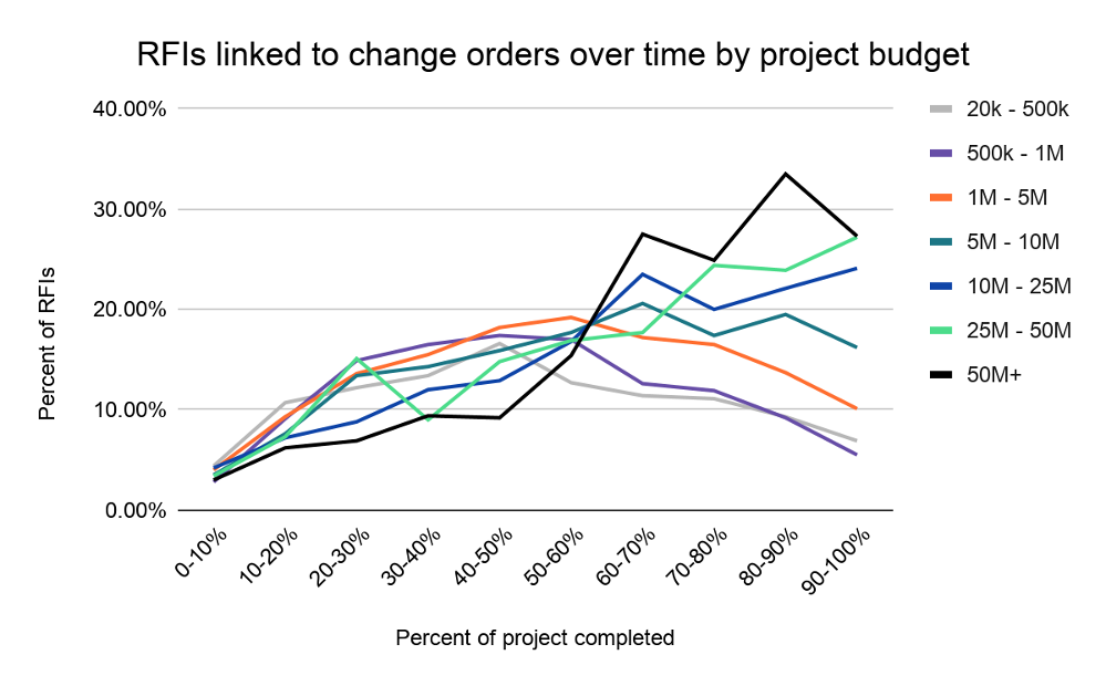 It is commonly said that the later an RFI occurs in a project, the more likely it is to have a cost or schedule impact. The chart below, with the percentage of RFIs linked to change orders, shows that that trend is largely true, particularly on larger projects. This highlights the need to get as many design and scope related RFIs resolved as early as possible.