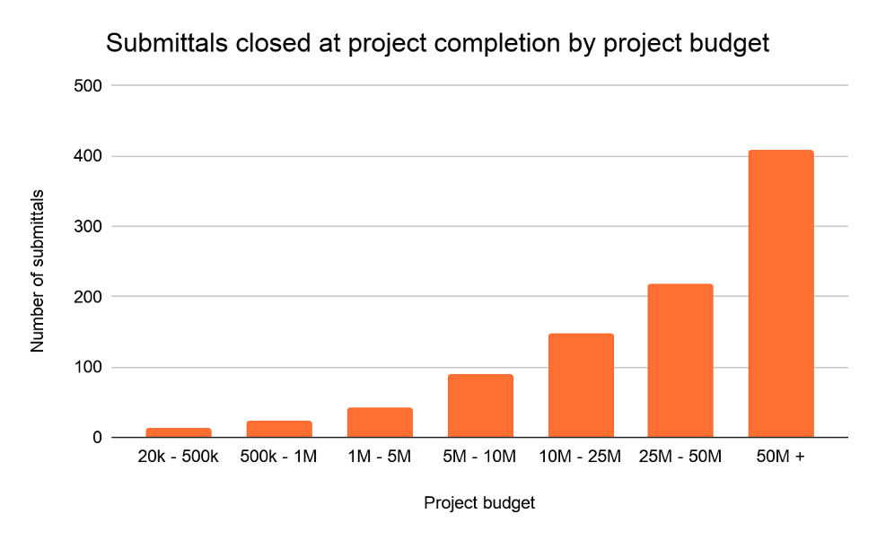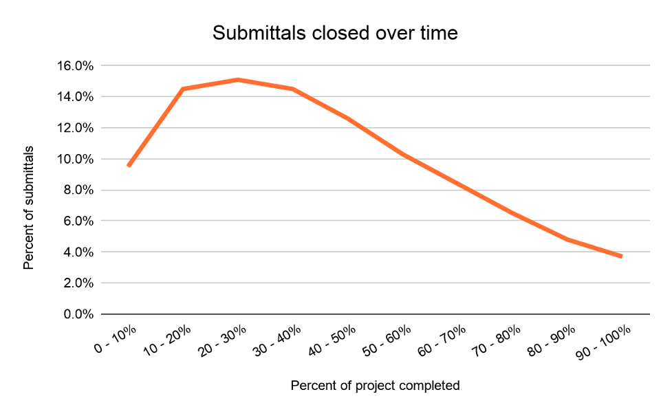 Submittal close rate is highest in the 10-40% period of the project timeline and tails off as the project progresses. This information can help you understand if your submittal close rate on a project is proceeding at a similar pace, or if it is falling behind, potentially indicating a delay.