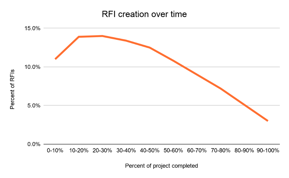 Ask yourself - when is your team asking questions? When are RFIs being created? Using Procore’s reporting capabilities you can look at what point in a project RFIs are being created and see if your RFI creation peaks earlier or later than the average.