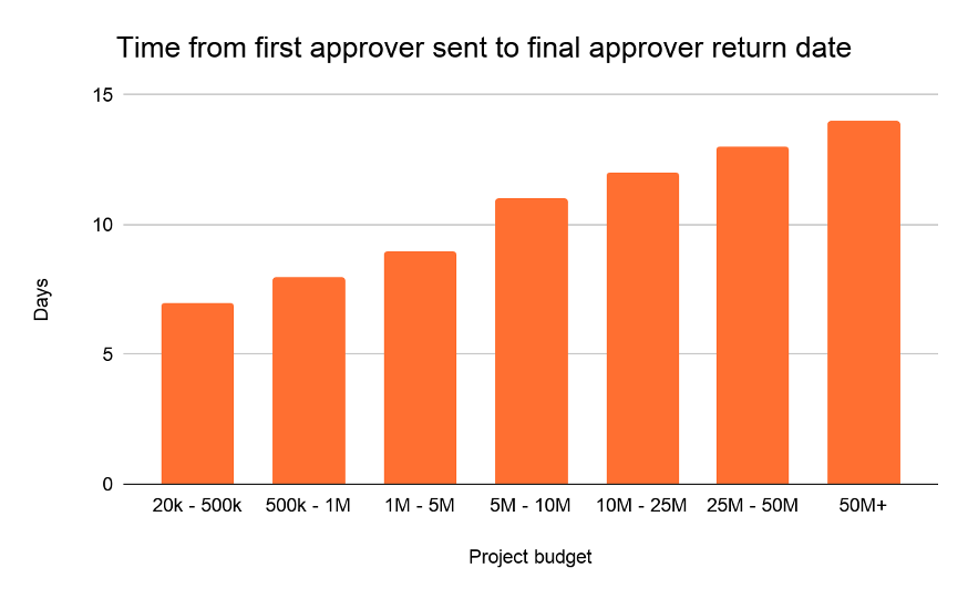 Across all projects, the average time between first sent date to final return date is 10 calendar days. Broken down by budget, the duration from first approver sent to final approver return date grows as project size increases.