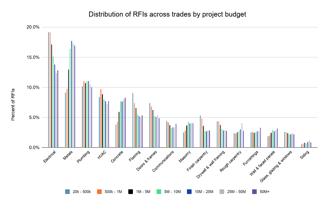 You’ll also be able to understand which trades typically have the highest number of RFIs and thus know to prioritize identifying potential questions from those trades early on to de-risk your project. The chart below shows a selection of common trades that we analyzed.