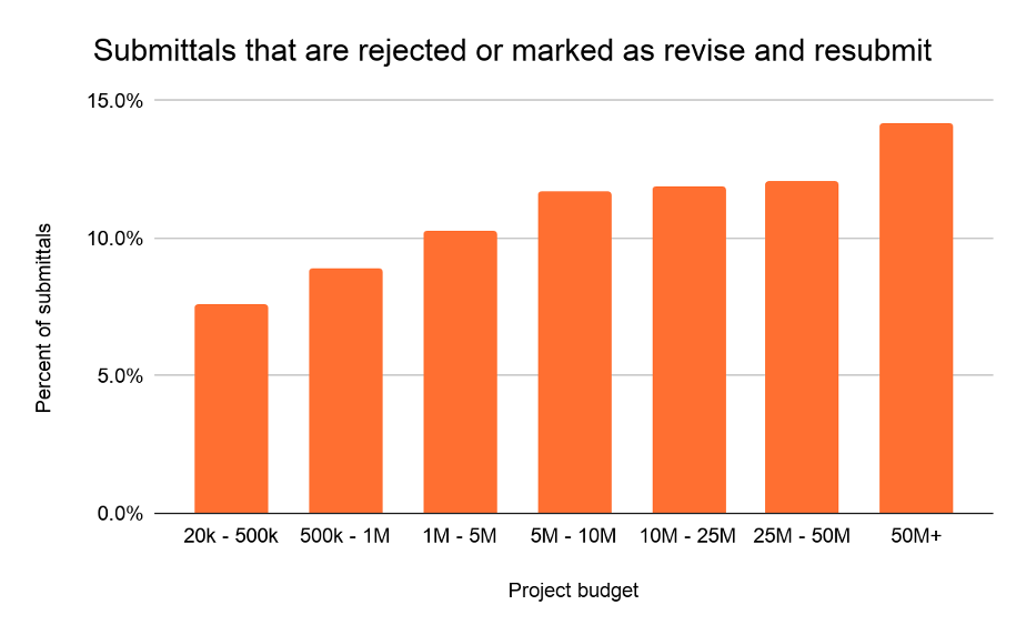 Overall, 9.2% of submittals are rejected or marked as revise and resubmit. When broken down by budget, we can see that larger projects tend to have a higher percentage of submittals that fall into this category. How do your projects compare?