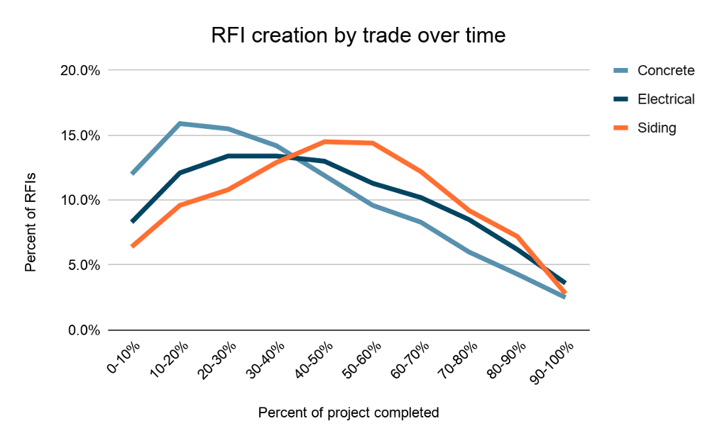 The rate of creation of RFIs over time differs by trade. Trades that are typically on site earlier, like concrete, generate RFIs earlier compared to trades that are on site later, like siding. By breaking RFI creation down by trade in this way, we can alert project teams if their project is deviating from trade norms.