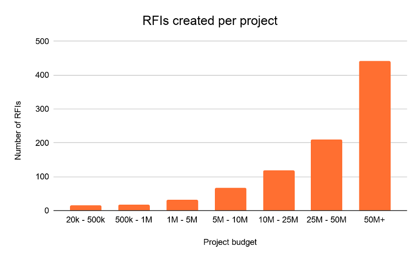 Project budget is directly related to the number of RFIs on a project. When comparing your projects to our benchmarks, we’ll only show you projects that are similar, ensuring that you can see how RFI creation compares only to relevant other projects.