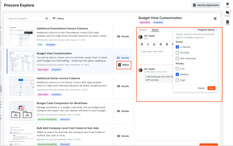 Beta beginning May 19. Procore Explore now empowers Company Admins with robust new tools to streamline beta program management. With the introduction of a centralized Notes tab, Admins can document setup requirements, track proposed testers, and capture internal feedback—all within Procore Explore. Notes are easily accessible from the program list, and permissions ensure only the original author can edit their own notes, while any Admin can delete notes as needed. Additionally, new Status and Priority tagging features allow Admins to triage programs more effectively. Assign statuses such as In Review, On Hold, or Not Interested to clarify each program’s evaluation stage, and use Low, Medium, or High priority tags to focus your team’s attention on the most impactful changes. These enhancements transform the program list from an overwhelming catalog into an actionable dashboard, supporting structured change management and cross-team collaboration. Join the beta through Procore Explore.