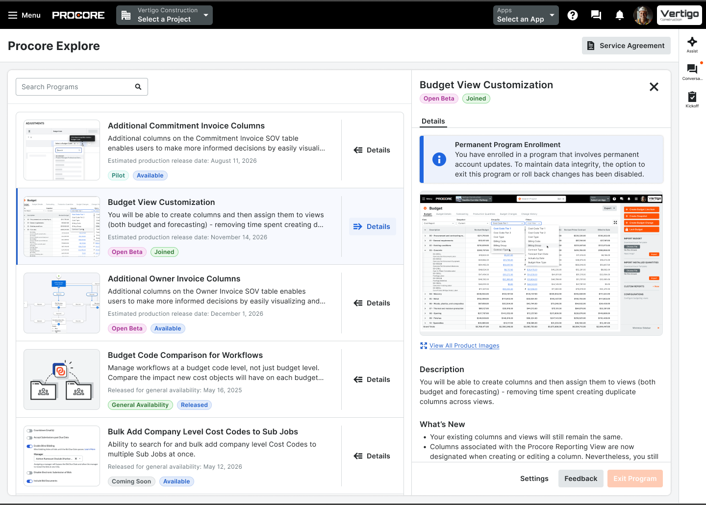 Start am 17. März. Procore Explore bietet jetzt verbesserte Kommunikations- und Kontrolloptionen, die Ihnen helfen, die Programmteilnahme transparenter zu verwalten. Bei ausgewählten Programmen werden Ihnen im Detailbereich und im Anmeldeformular deutlich sichtbare Warnhinweise angezeigt, die wichtige Informationen vor und nach der Anmeldung enthalten. Diese Warnmeldungen sollen sicherstellen, dass Unternehmensadministratoren über alle spezifischen Anforderungen oder Risiken vollständig informiert sind, bevor sie sich für eine neue Funktion entscheiden.