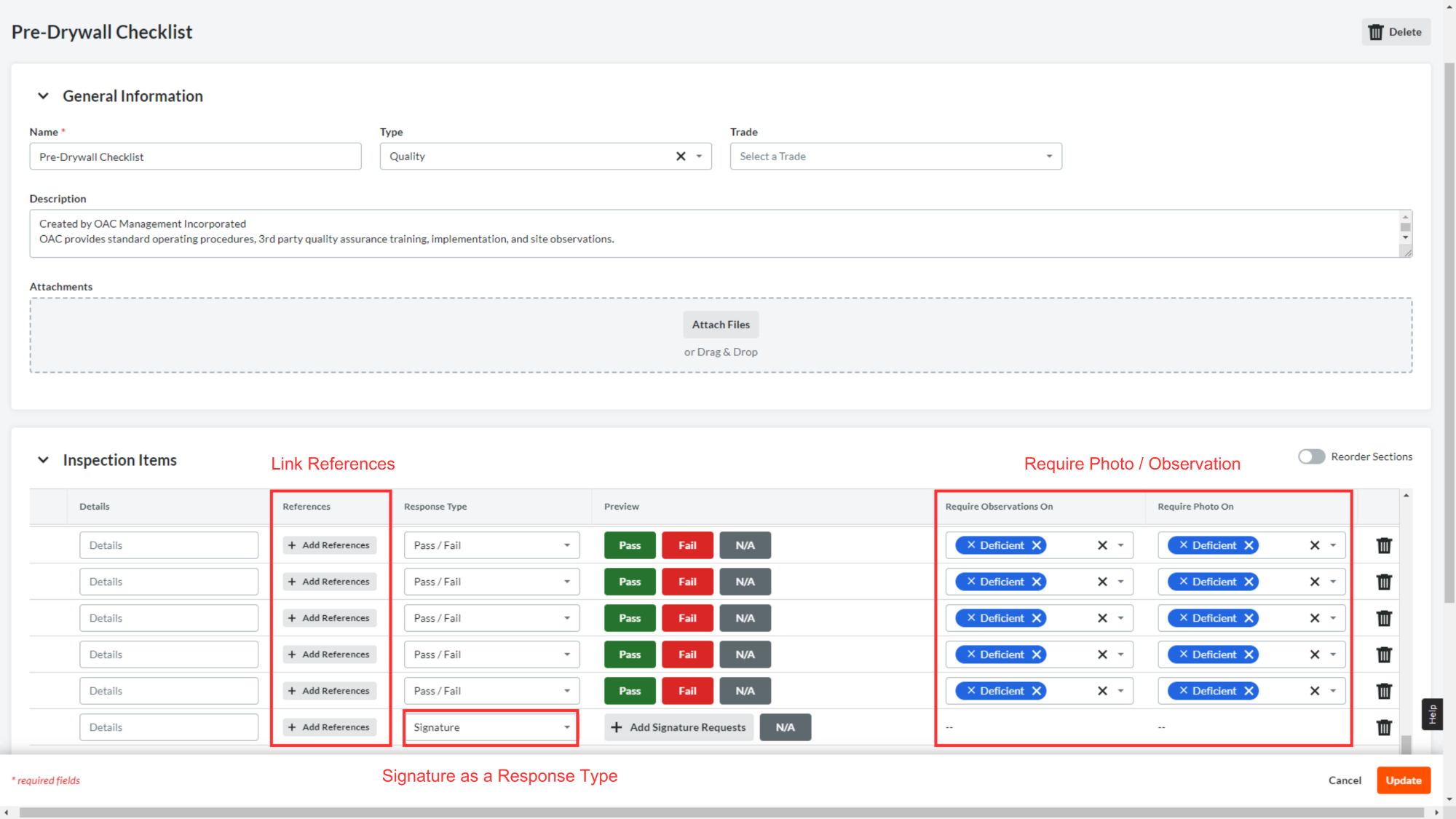Kunden können jetzt ein Foto und/oder eine Bemerkung auf der Grundlage der ausgewählten Antwort für eine Inspektionseinzelposition anfordern. Dies entspricht dem Bedarf an mehr Flexibilität und Granularität, um die erforderlichen Maßnahmen nach der Auswahl einer Antwort zu definieren und so die Verantwortlichkeit und Genauigkeit im Inspektionsprozess zu gewährleisten. Eine weitere neue Funktion ist die Möglichkeit, Referenzen zu Inspektionseinzelpositionen hinzuzufügen, einschließlich Plänen, Fotos und Anhängen auf Projektebene und Anhänge auf Unternehmensebene. Dies geht auf die Herausforderung ein, dass die Benutzer mehr Informationen über die zu erledigende Arbeit benötigen, und bietet ihnen zusätzlichen Kontext und Klarheit, so dass die Erwartungen klar verstanden werden. Dies führt zu einer Reduzierung der Zeit, die mit der Suche nach Klärungen, Verzögerungen und Nacharbeiten verschwendet wird. Darüber hinaus ist die Einführung von Signaturen in der Antwort auf die Einzelposition eine erhebliche Verbesserung, die es den Benutzern ermöglicht, bestimmte Einzelpositionen zu unterzeichnen. Diese Funktion eignet sich für Szenarien, in denen mehrere Gewerke oder Parteien an einer Inspektion beteiligt sein können, bietet Flexibilität und gewährleistet die ultimative Rechenschaftspflicht. Zu guter Letzt enthält das Verteilerfeld "Inspektionen" auf Android jetzt neben den Benutzern auch Verteilergruppen. Bisher war dies nur auf IOS und im Web verfügbar.