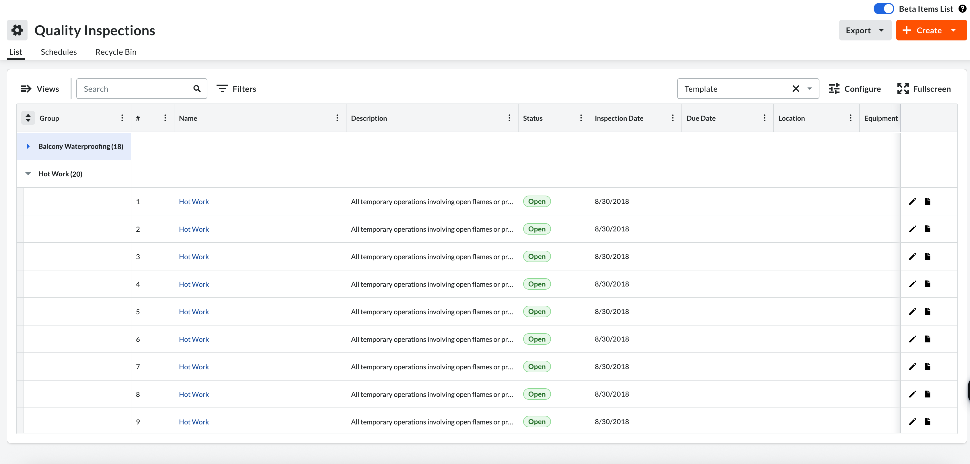 Beta-Phase ab dem 17. März. Wir freuen uns, Ihnen eine modernisierte Listenansicht für Inspektionen vorstellen zu können, die ab sofort als Betaversion für Webnutzer verfügbar ist. Mit diesem Update wird die Inspektionsliste an die neuesten Designstandards von Procore angepasst und bietet die von den Kunden geforderte Flexibilität. Sie können nun anpassen, welche Spalten in Ihrer Listenansicht angezeigt werden – einschließlich der Unterstützung für benutzerdefinierte Felder –, sodass Sie Inspektionsdaten so organisieren und analysieren können, wie es für Ihr Team am besten funktioniert. Erweiterte Gruppierungs- und Sortieroptionen erleichtern den Zugriff auf die benötigten Informationen, reduzieren den administrativen Aufwand und optimieren Ihren Arbeitsablauf.