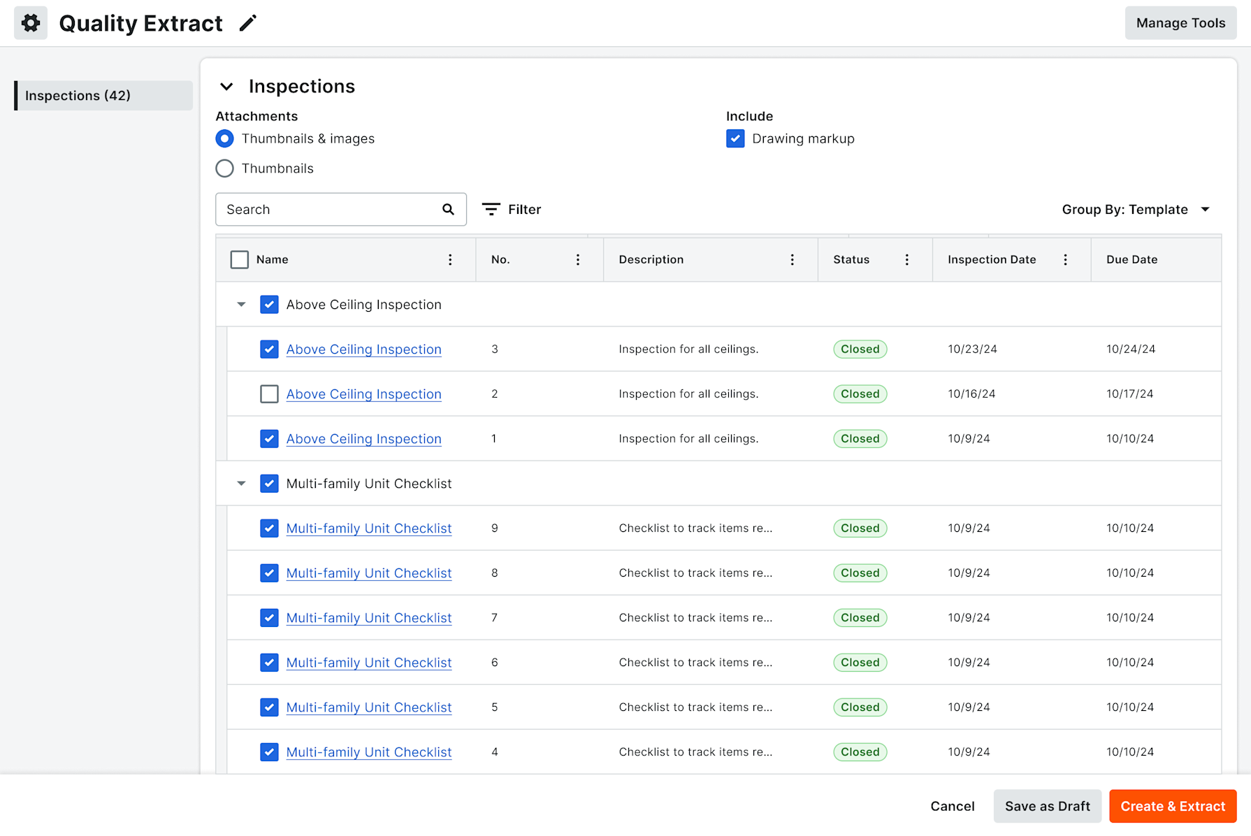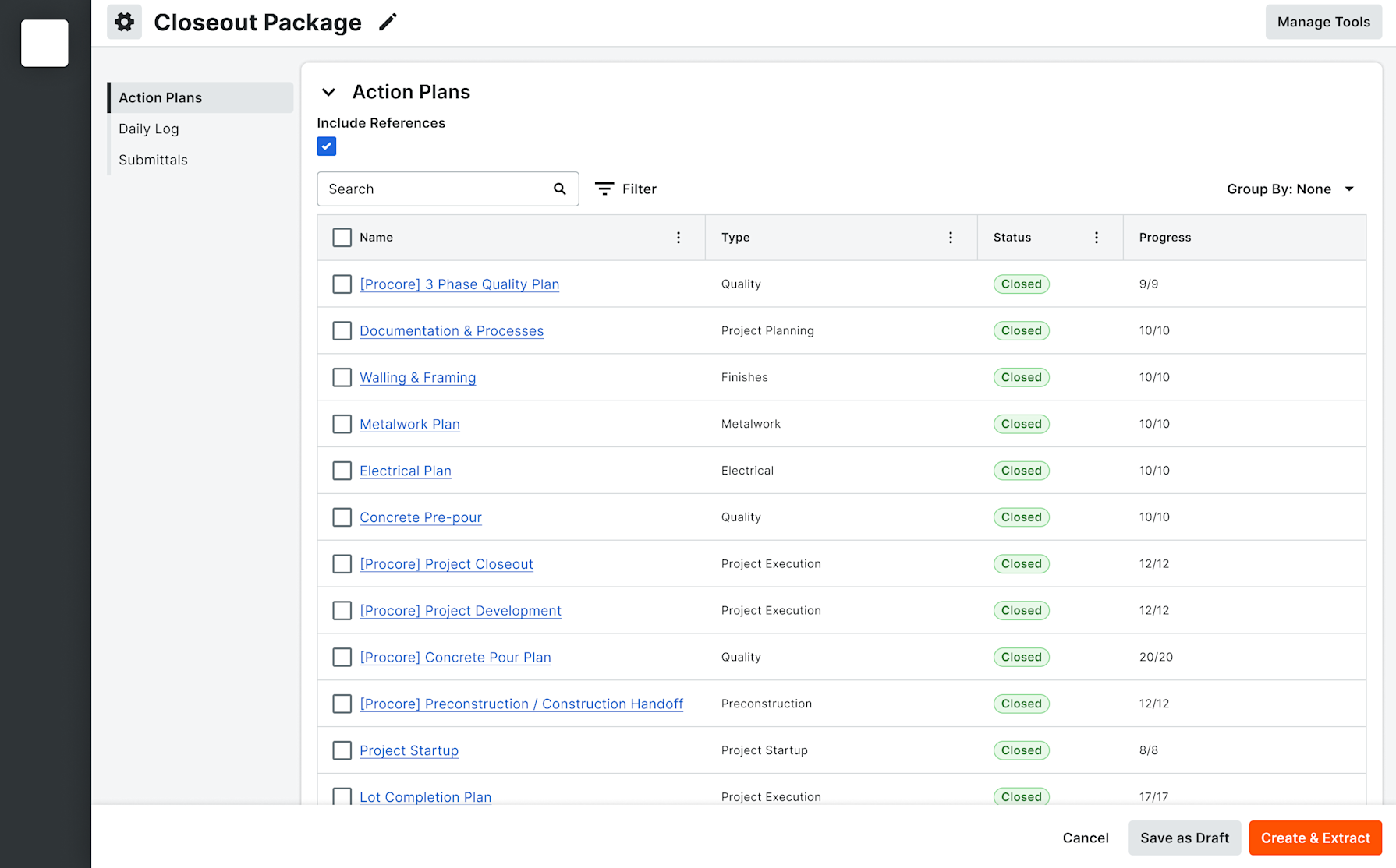 Tailor each export to your owner’s requirements by filtering to only the records that matter, grouping by spec section, trade, subcontractor, or date, and choosing whether to include attachments and a table of contents. Run extracts in the background while you keep working in Procore, then share the downloadable package with internal and external stakeholders for a clean, professional handoff that’s easy to review, store, and reference long after the project is complete.