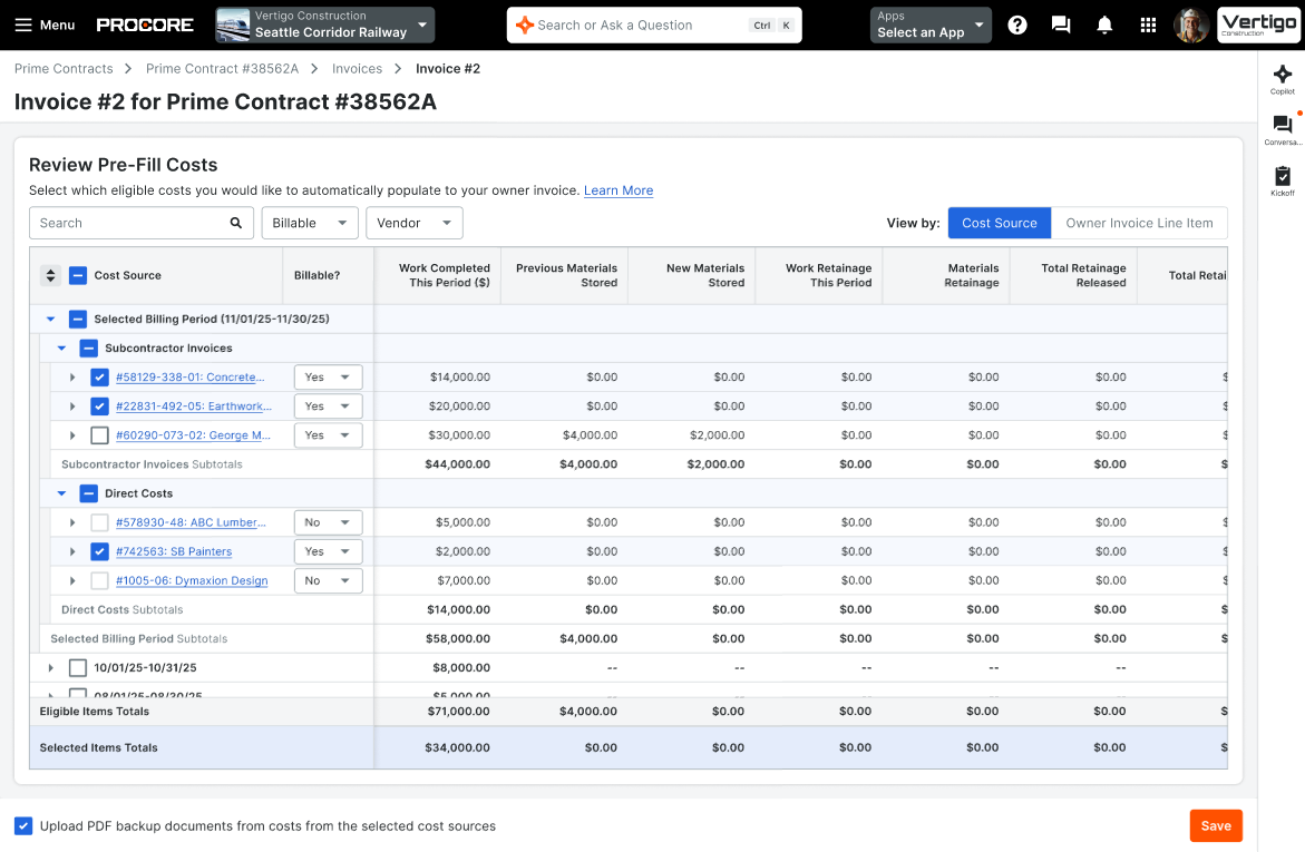Beta update beginning May 1. Take control of your owner billing process with the new Owner Invoice Prefill Cost Selection. Previously, costs were automatically prefilled to Owner Invoices based on rigid date parameters, often requiring manual adjustments or causing users to bypass the automated process altogether. With this update, you can now review and hand-select which costs to prefill, split Sub Invoice and Direct Costs by line item across multiple billing periods, and mark specific costs as Non-Billable—all before generating your invoice. These enhancements reduce manual data cleanup and ensure every invoice accurately reflects project progress and billable agreements, giving you the flexibility and accuracy you need for streamlined financial management. Join the beta through Procore Explore.