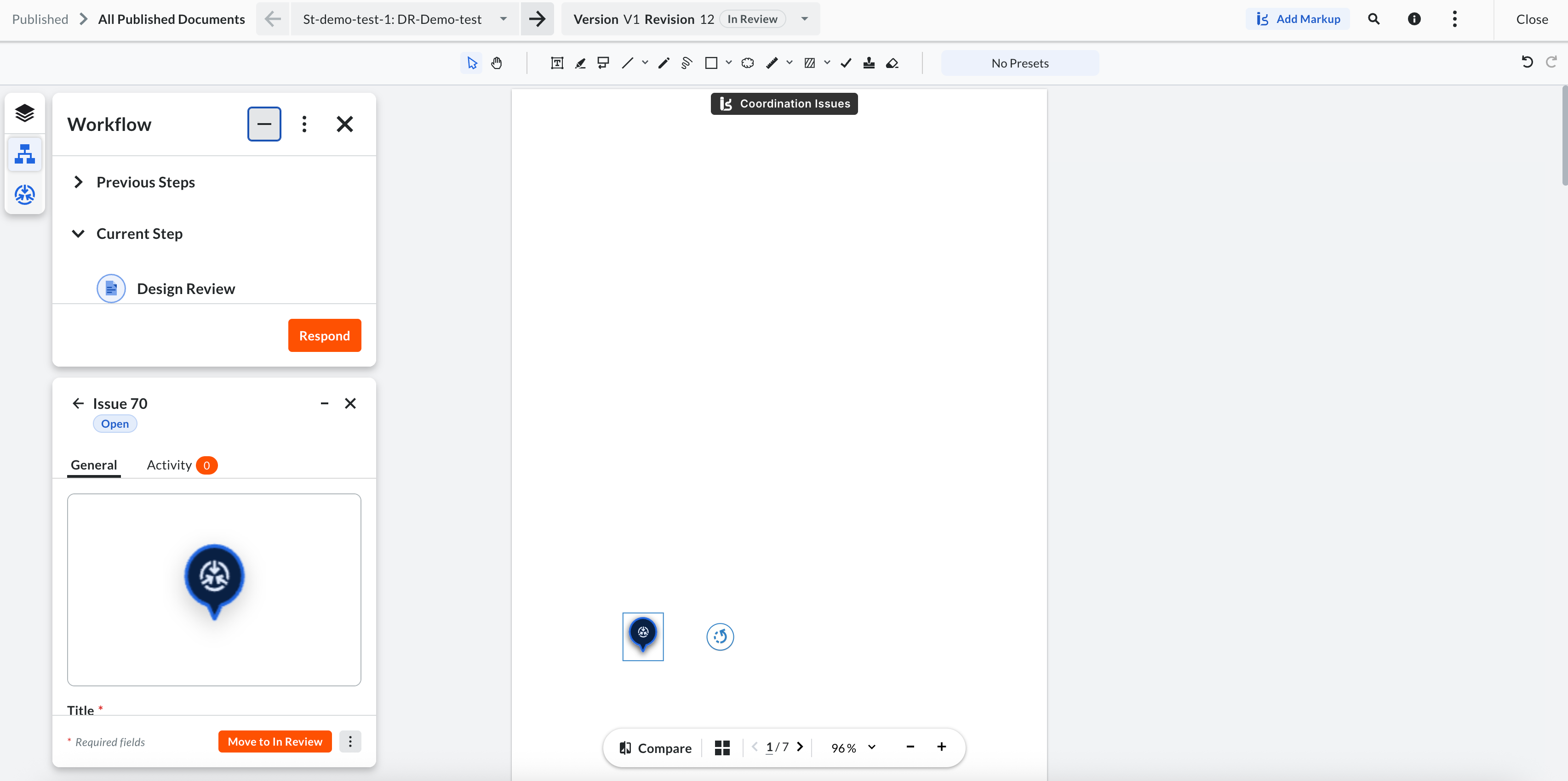 Launching April 21st. Procore introduces Phase 1 of the Comment Register (Comment Register Light) in the 2D Unified Viewer for PDM (PDFs/Drawings), empowering users to create and track review comments as Coordination Issues (CIs) directly within active workflow steps. Now, step assignees can quickly create CIs by placing a mandatory pin on the document and entering a description—ensuring every comment is spatially anchored and easily traceable. Titles are auto-generated for speed, but remain editable, and unresolved issues persist across document revisions and workflow cycles for robust accountability.