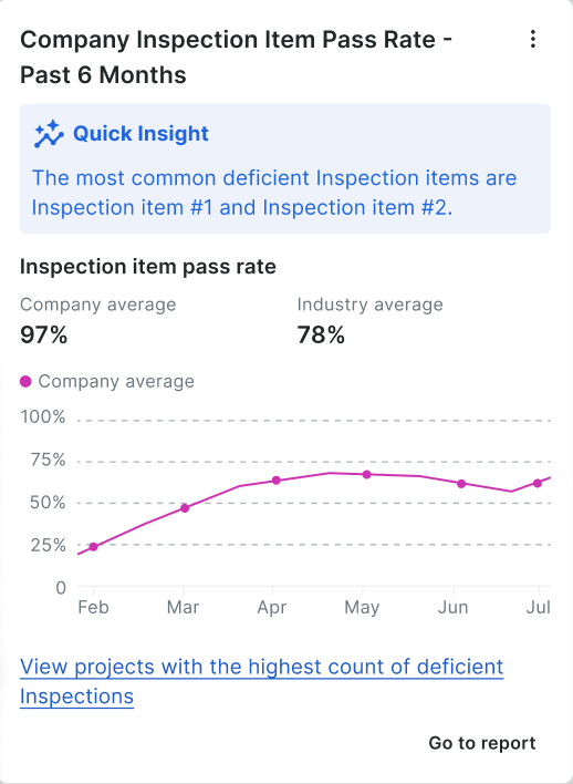 With this enhancement, project teams and company leaders gain actionable data to drive quality initiatives, reduce costly rework, and minimize inspection delays. The insight provides detailed breakdowns and interactive features—such as trend analysis over the last six months, identification of items or projects with the highest deficiency rates, and direct links to detailed reports—making it easier to address quality concerns proactively. Ultimately, this new capability helps you stay ahead of quality issues, streamline workflows, and keep your projects on track.