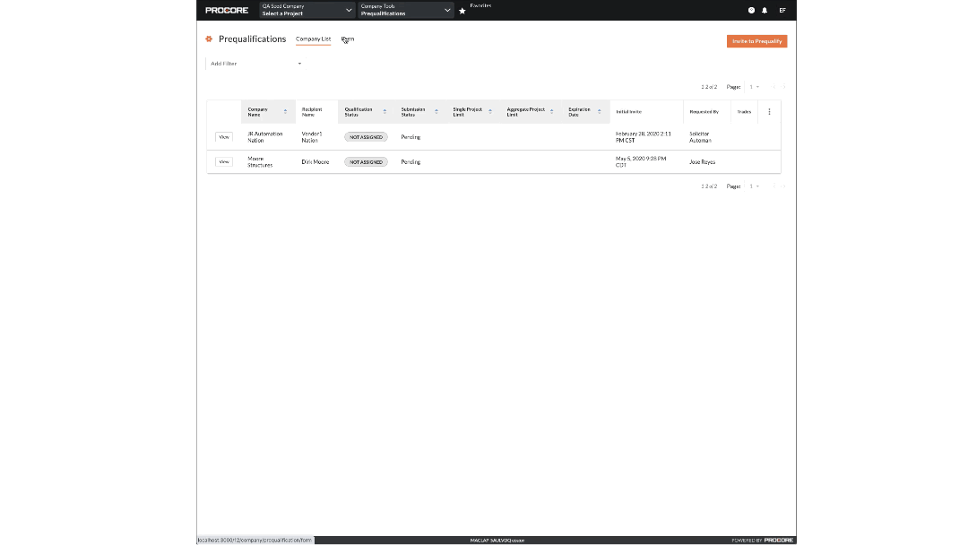 Once you begin qualifying companies through , you can jump right into Procore Bid Management and filter by Qualification Status to ensure you only invite qualified companies to bid. With a single solution for both your risk management and estimating teams, you can bid with confidence knowing that risk has been assessed before contracts are awarded.