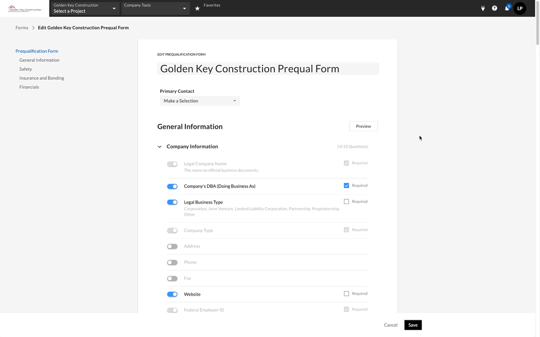 Expanding on Procore’s preconstruction solutions aimed to maximize time and minimize risk during the critical preconstruction phase, provides companies with tools to increase efficiency during the bidder evaluation process. We made it easy to create and configure your company’s default prequalification form with a robust list of questions selected by industry professionals; simplifying the collection of general information, safety, insurance and bonding, and financial data.