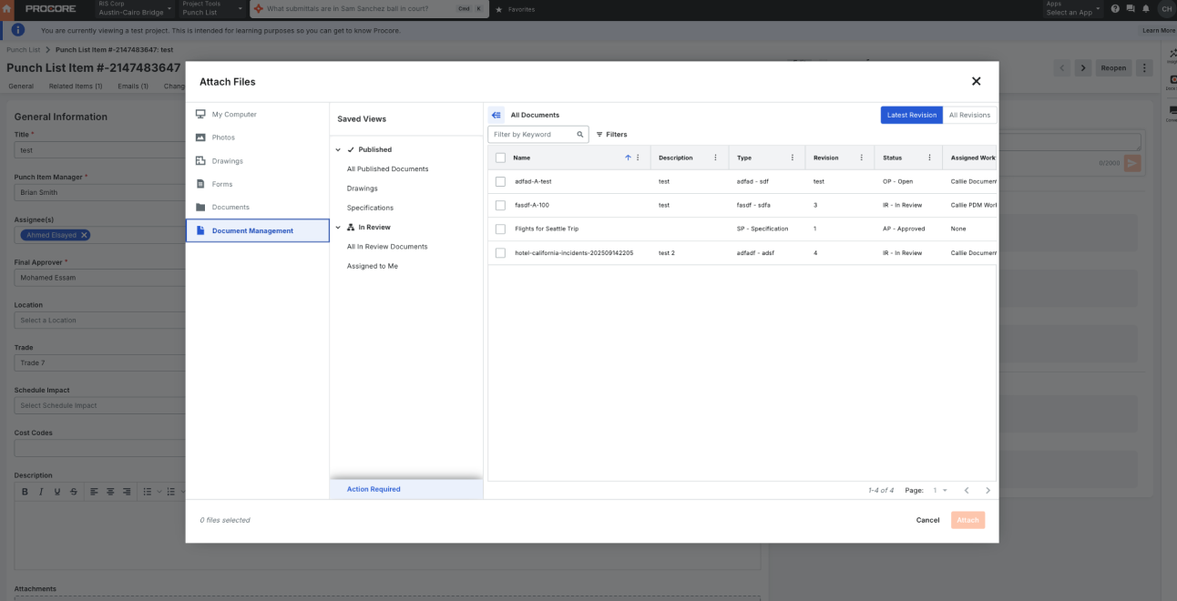 Launching April 21st. You can now seamlessly attach documents from Procore’s Document Management tool directly to Punch List items. This enhancement allows users to view both Document Management and standard attachments in a unified viewer, making it easier to access all relevant files in one place. You’ll benefit from improved collaboration with features like attachment status updates, activity comments, and detailed change history—all accessible through the unified viewer. Email notifications now include an attachment data table and deep links for quick access, while PDF exports provide comprehensive item and list views. This update streamlines document management for Punch Lists, helping teams stay organized and ensuring critical information is always at your fingertips.
