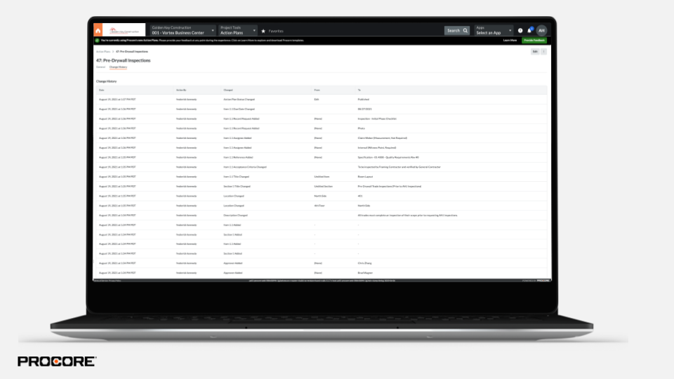 Action Plans creates an environment where delivering on quality and safety plans are effective and streamlined. This solution supports quality teams around the world with a truly collaborative tool for executing Inspection Test Plans (ITPs), allowing teams to move quickly without compromising on quality. We recently released the ability to track change history in Action Plans, enabling users to see when changes were made and by whom.