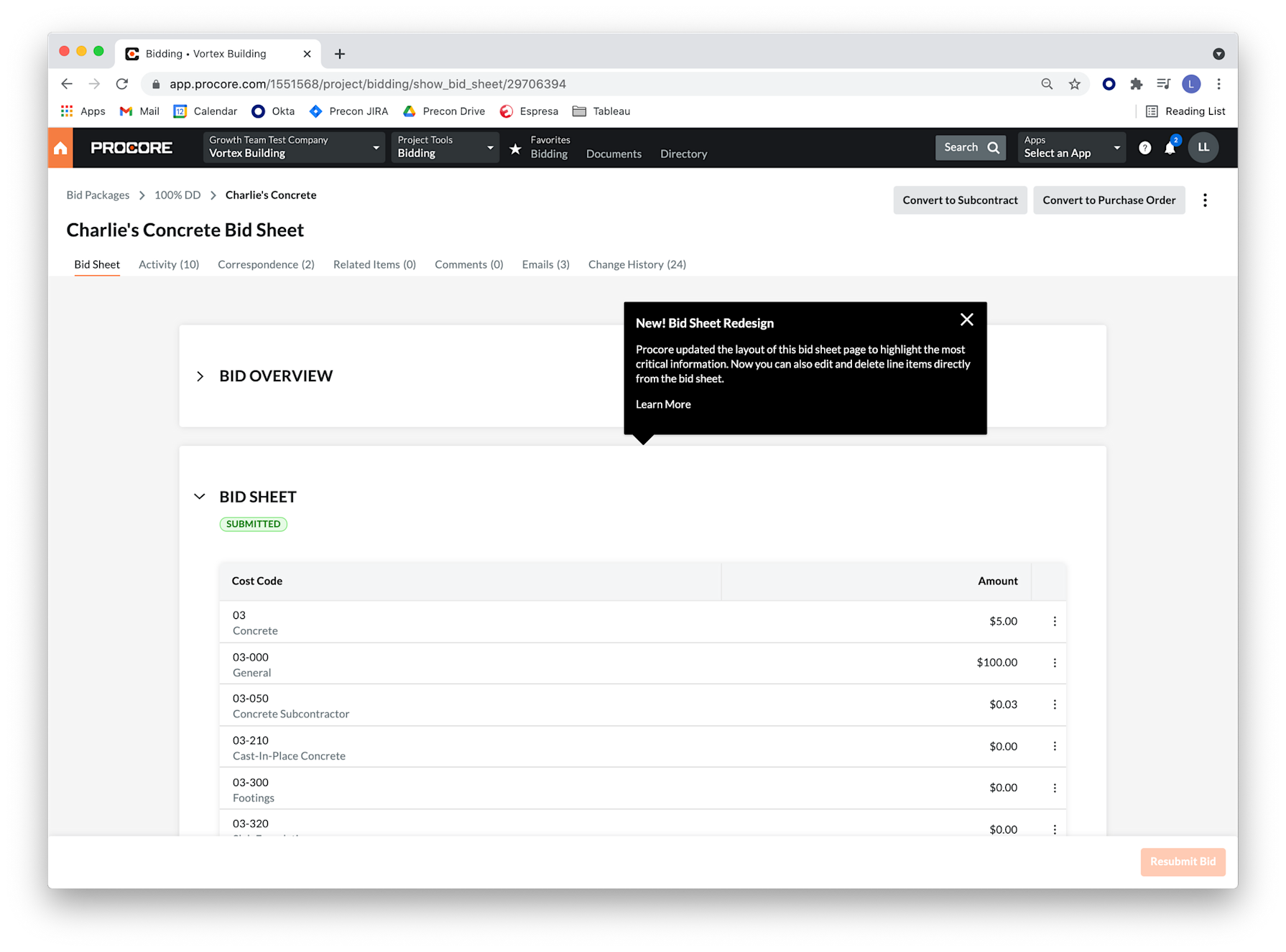The newly redesigned bid sheet provides teams with visibility into each bid, plus two new pieces of functionality: the ability to both edit and delete cost codes directly within the bid sheet. Additionally, users can now export bid sheets into a CSV file, giving you additional options to analyze bids in Excel or other tools.
