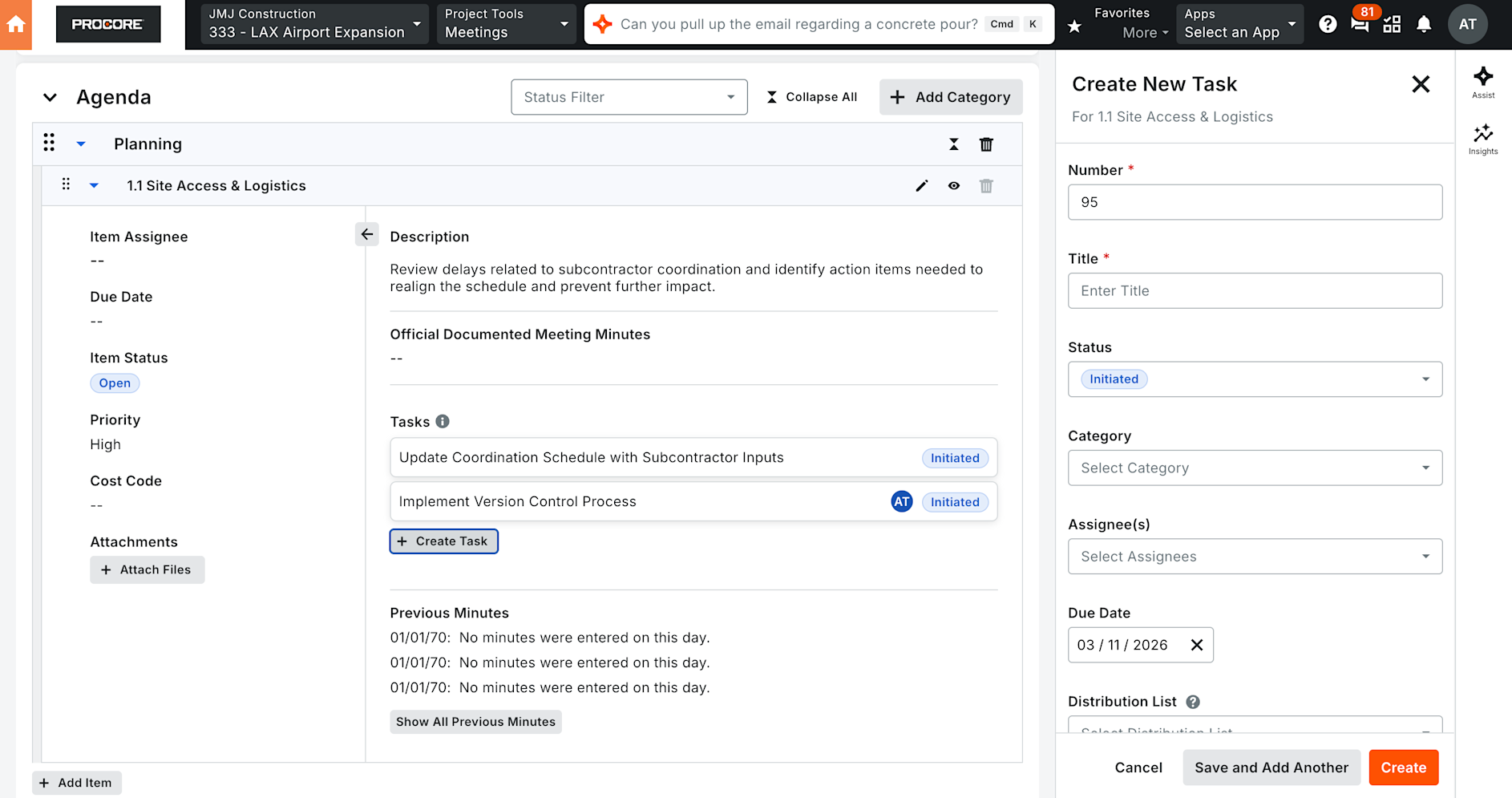 Launching April 21st. Procore now offers a direct integration between the Meetings and Tasks tools, empowering users to create, assign, and track actionable tasks straight from meeting items. This enhancement eliminates manual duplication and ensures that assignees receive timely notifications, while providing clear visibility into the status and origin of every task. Open tasks automatically carry over to follow-up meetings, and all action items are tracked in a centralized, structured workflow—making meeting follow-ups more efficient than ever.