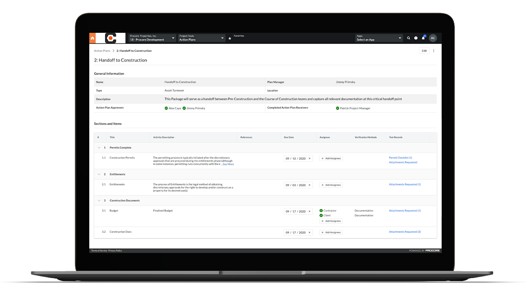 Procore’s Action Plans tool can be used to implement a phased review process to ensure that project development is progressing according to expectations. Define quality control checkpoints, consolidate related documentation (such as Specifications, Drawings, Photos, and Documents), assign steps and tasks to stakeholders, define and validate success criteria (with a digital Inspection checklist), and get final signoff before moving onto the next phase.