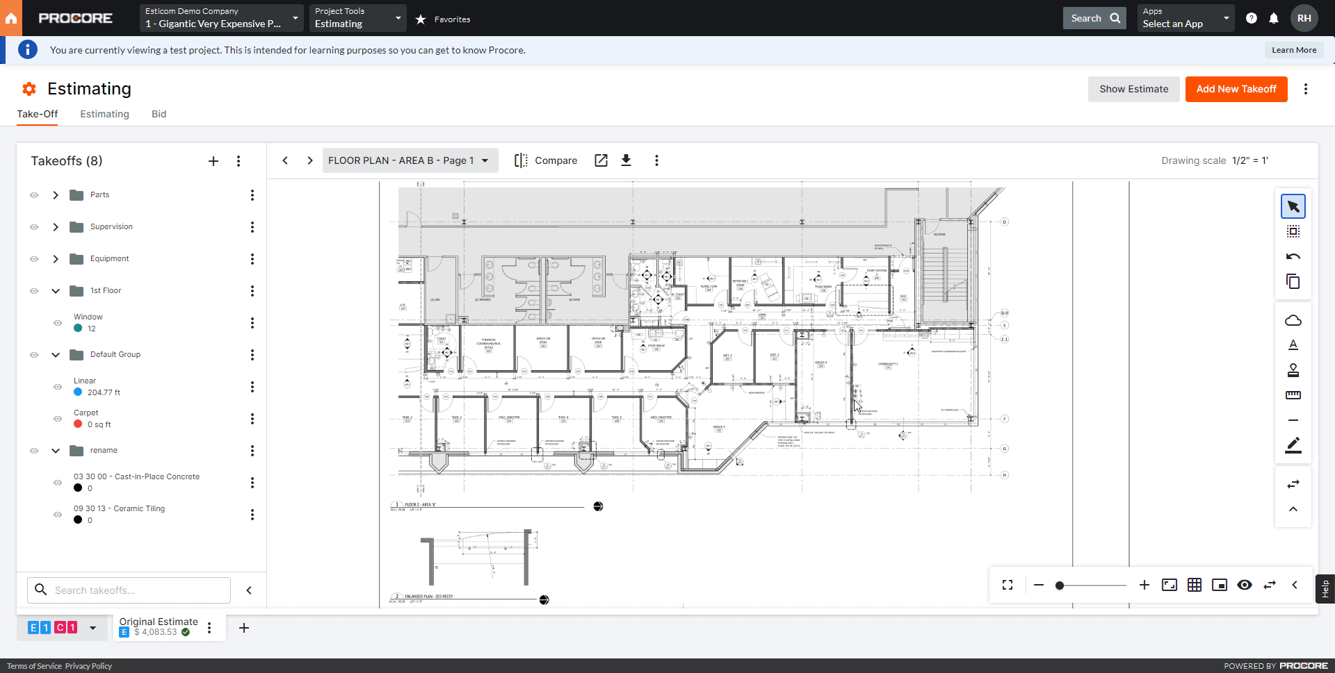 For many, Automated Area Takeoff can help cut down time spent on the area takeoff process substantially. Instead of needing to manually trace outlines of each room while adding a takeoff on a floor plan, users can now click one button to run a room detection across one or multiple drawings. After the detection is complete, users can select all the detected areas for a drawing at once, or select specific rooms individually. Automated takeoff is also now available for concrete, and roofing takeoffs will be supported by Fall 2022.