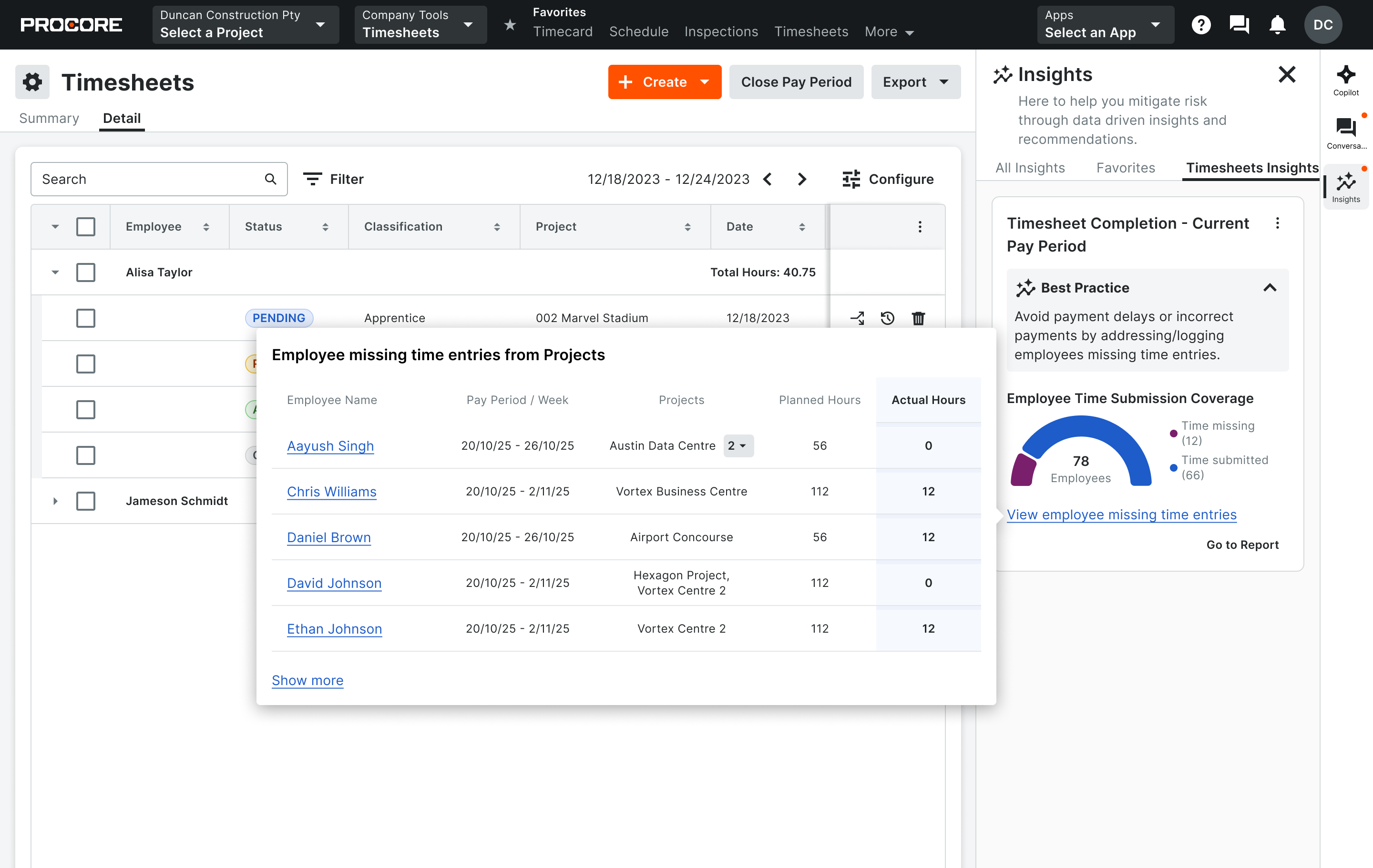 Access to this feature is controlled by a new granular company-level permission, “View Company Timesheet Insights,” available to Company Admins, Insights Admins, and users with the appropriate permission. The insight is available to customers entitled to Procore Analytics or Insights (Resource Management).