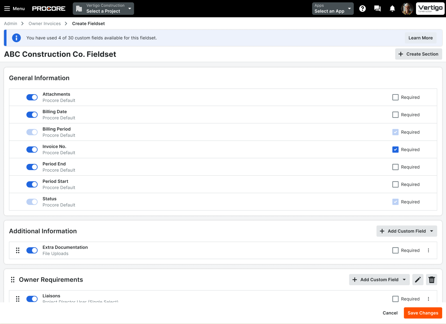 Beta beginning February 16th. You can now add custom and configurable fieldsets to Owner Invoicing in Procore. This enhancement empowers you to tailor Owner Invoice forms by introducing new fields of various types, specifying which fields are required, and removing unnecessary standard fields. This update also brings the new Owner Invoicing experience to feature parity with the legacy tool, supporting a seamless transition and enabling custom fields to drive PDF export templates. Ultimately, this release streamlines data collection, improves reporting accuracy, and supports a more efficient invoicing workflow for all project stakeholders. Join the beta through Procore Explore.