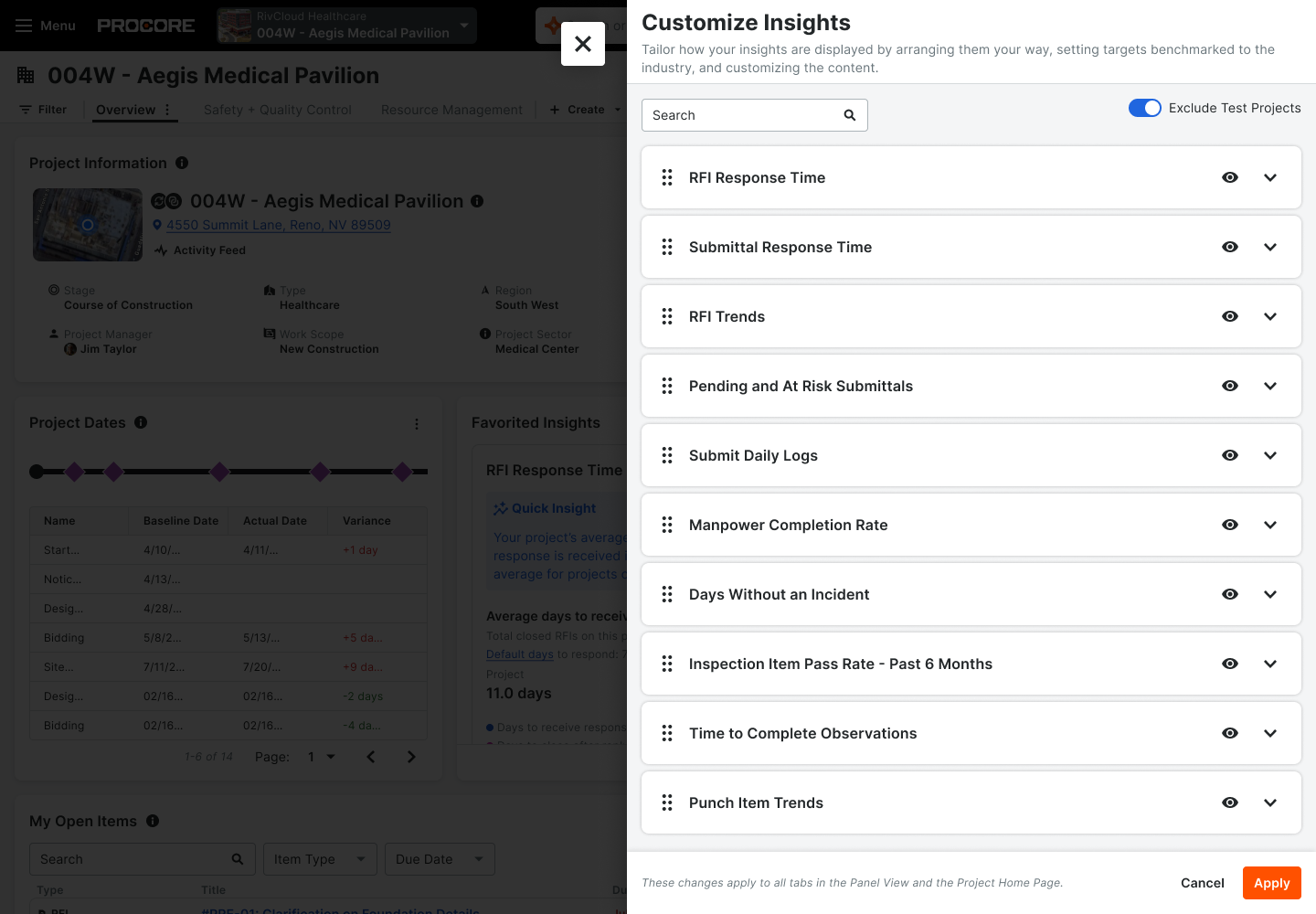 Launching May 19. You can now ensure your company-level analytics reflect only real, active projects with the new “Exclude Test Projects” toggle in Procore Insights. Available in the Company Insights side panel’s Customize modal, this feature lets you easily filter out any projects marked as “Test” from all Insights calculations—including metrics, aggregations, trends, and benchmarks. By default, the toggle is set to OFF, giving you full control over your data. When enabled, test and non-production projects are omitted, preventing them from skewing your company’s performance analytics. This enhancement was driven by customer feedback requesting more accurate and actionable Insights. By excluding test projects, you gain greater confidence in your analytics, leading to better decision-making and increased trust in your data. This update also addresses a top customization request and is expected to boost engagement and adoption of Insights across your organization.