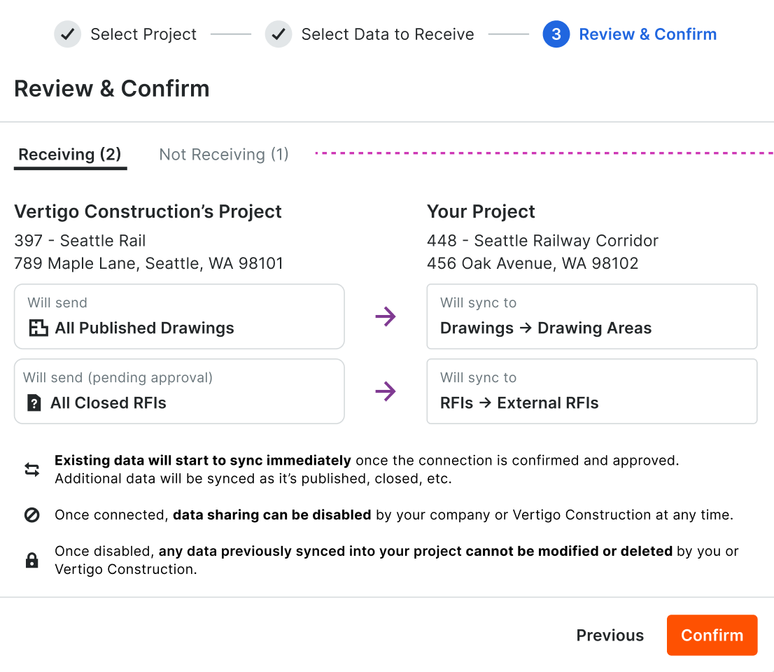 Launching May 19. Procore Connect’s Connection Manager now empowers companies with multi-directional connections, giving you the flexibility to independently customize the flow of project data for each tool within a connection. With the new Tool Configuration page, you can easily choose whether your company acts as the sender or receiver for individual tools—such as RFIs, Submittals, and more—within a single project connection. This update also introduces clearer terminology, replacing “Upstream” and “Downstream” with “Sending” and “Receiving” parties, making it easier to understand and manage your data sharing preferences.