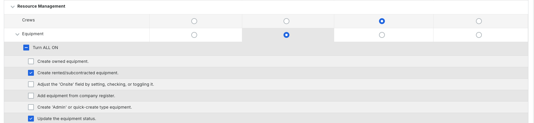 These new permissions empower field staff to efficiently update statuses, manage project check-ins, and record rentals, while ensuring that more sensitive actions—like creating owned equipment records—remain restricted to authorized personnel. This update helps organizations streamline equipment management, improve accountability, and maintain tighter control over sensitive data and actions.