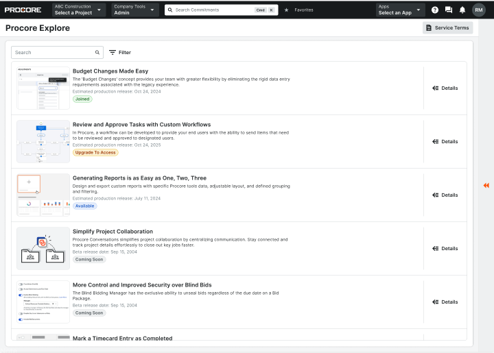 Launching March 17th: Procore Explore now gives Company Admins direct access to their signed service agreement. Through the new ‘Service Terms’ button and side panel, you can instantly view or download agreements and see exactly who signed on behalf of your organization, including their email and timestamp. This update removes the need for manual requests to Customer Success or Product Management. By providing immediate visibility, Procore Explore helps large organizations maintain compliance and transparency while reducing administrative overhead.