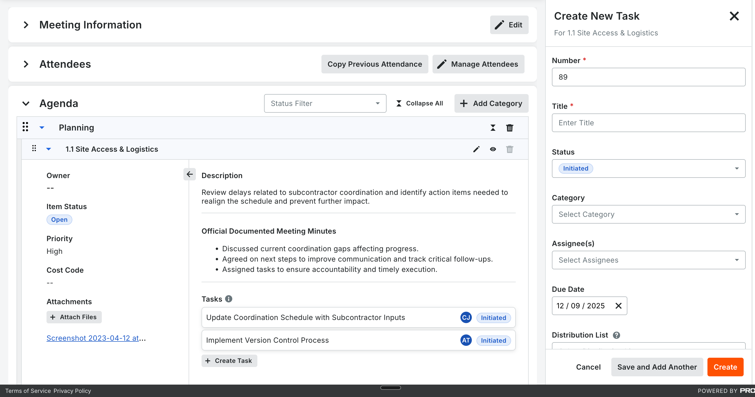 Turn meeting decisions into action instantly. Create, assign, and track tasks directly from Meetings for faster follow-ups, better visibility, and less manual work. Open tasks carry over to follow-up meetings, ensuring nothing falls through the cracks and teams stay aligned and accountable. This integration streamlines workflows and boosts project efficiency. Opt in to the beta through Procore Explore.