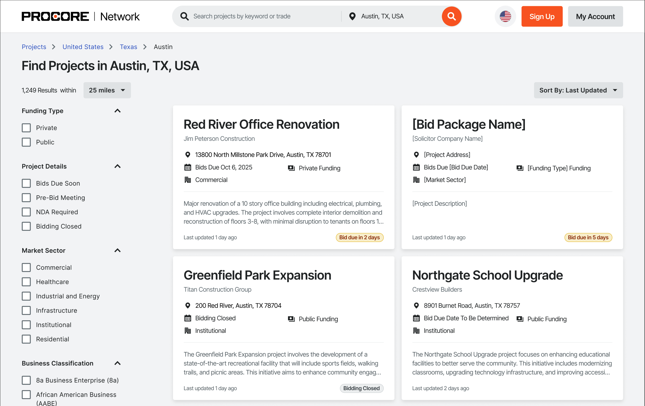 Introducing the “Projects Open to Bid” feature on the Procore Construction Network (PCN), now available in open beta for US users. This new capability empowers General Contractors and Owners to easily publish and promote public projects to a nationwide network of vendors, ensuring compliance with public posting requirements and expanding access to a broader, more diverse pool of bidders.
