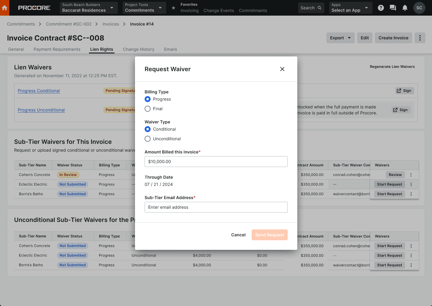 Sub-Tier Waiver eSignature feature provides a seamless experience for subcontractors by automating waiver generation and reducing manual uploads. Building on top of the existing sub-tier waiver tracking, your trade partner, project manager, or project accountant will be able to generate sub-tier waivers, using the same template selected for your subcontractor waivers, and send them for signature to a sub-tier contact. With this improvement, you’ll have the ease of collecting sub-tier waivers digitally with the flexibility of (and ability to review) sub-tier waiver PDFs uploaded directly.