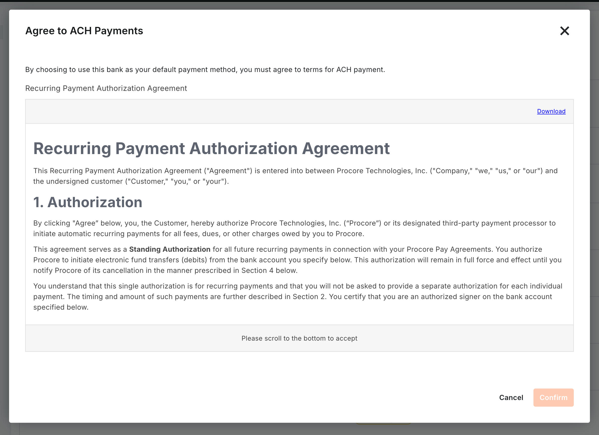 Launching May 19. Procore Pay now offers specialty contractors the flexibility to pay platform access fees directly from their connected bank account using ACH debits. Previously, payees could only use a credit card, which often created onboarding friction—especially for those without company card access or with strict internal policies. With this update, you can set any screened bank account, including the one you already use to receive payments, as your default payment method for fees.