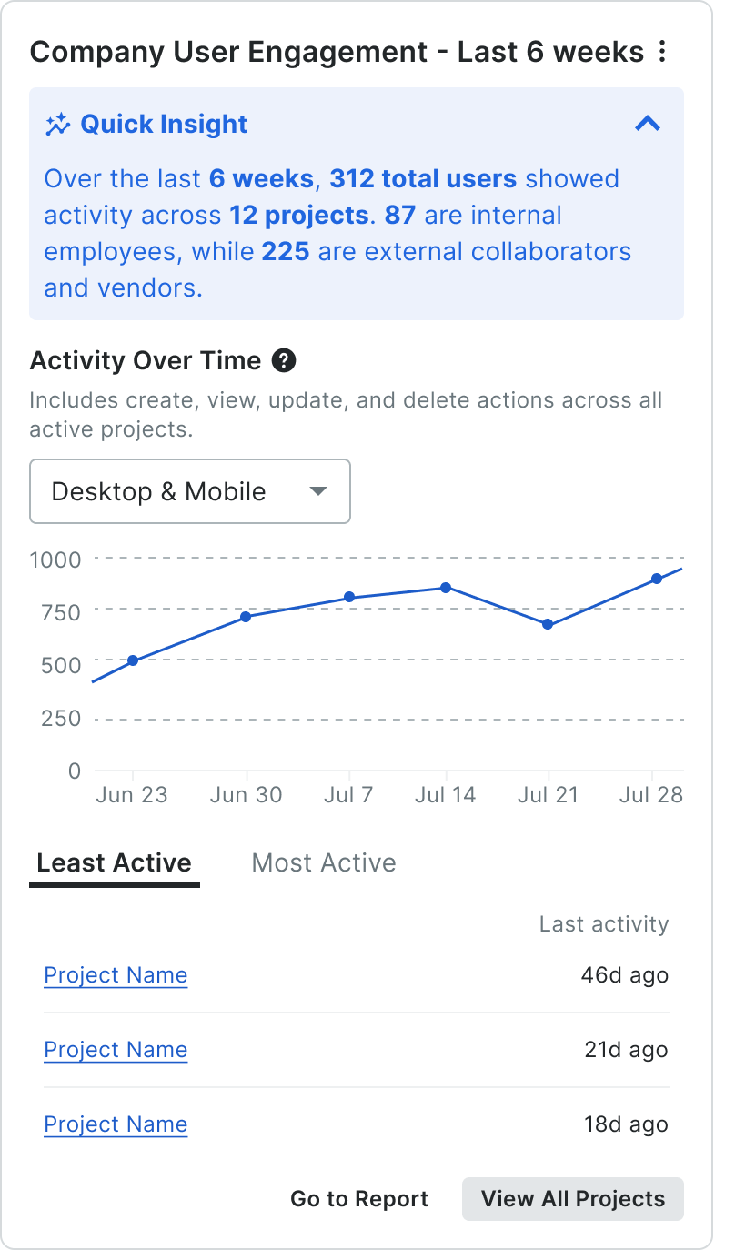 Leaders can track engagement trends over time, filter by project or platform, and drill down into a “View All Projects” modal to see user-level details, including last activity, activity counts, and top tools used. This enhancement empowers executives and admins to identify adoption gaps, target training and enablement efforts, and validate the impact of rollouts and change initiatives. By providing actionable data on who is engaging with Procore and how, organizations can drive higher adoption, maximize ROI, and ensure key roles are leveraging the tools that matter most.