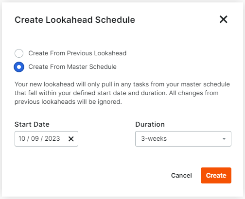 Introducing a new option to create lookaheads from the Master Schedule. Now, you have even more flexibility because you can choose to create a lookahead from either a Previous lookahead or start fresh from the latest Master Schedule, excluding any overlapping tasks or new subtasks from the previous lookahead.