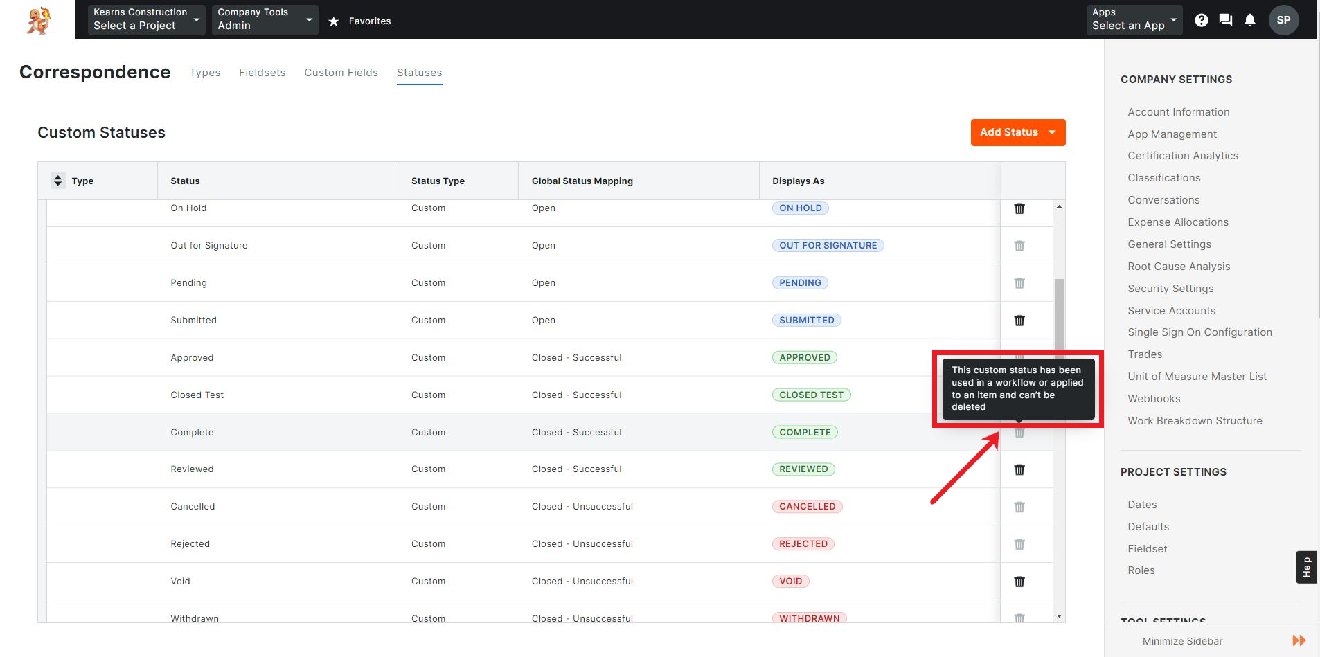 Now, custom statuses in correspondence cannot be deleted if they have been used in a correspondence item or a step in a correspondence workflow. This update ensures that your project data remains consistent and reliable, giving you greater peace of mind and control over your communications.