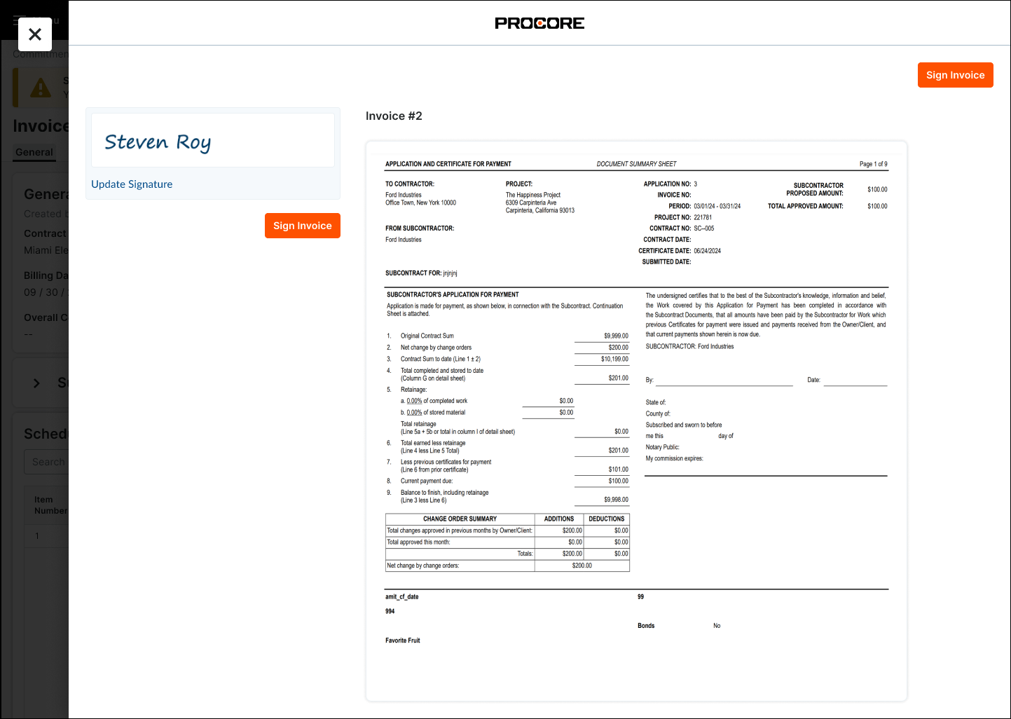 Beta beginning on February 17th. Procore Pay introduces a streamlined invoice signing experience for subcontractors, available in open beta for US customers. This release addresses a key gap in the invoicing process by enabling subcontractors to sign their invoices natively within Procore during submission—eliminating the delays and inefficiencies of waiting for separate DocuSign emails after invoice approval.