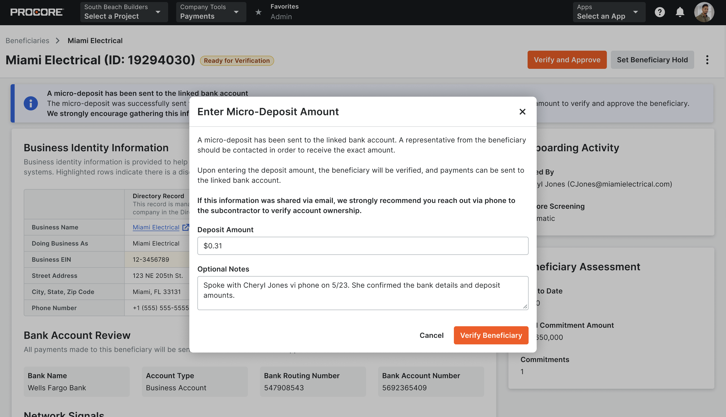 Launching May 19. Procore Pay now features a robust, mandatory ownership verification workflow for all subcontractor (Payee) bank accounts. General Contractors (GCs) can now verify bank accounts using two secure methods: an ACH micro-deposit process—where a small, random amount is deposited for confirmation—or a manual last-4-digit check. After Procore screens the bank account, a micro-deposit is sent, and GCs are prompted to confirm the deposit amount with the subcontractor before approving payments. This enhancement ensures that only accounts truly controlled by the intended subcontractor are approved for payment, significantly reducing the risk of fraud and misdirected funds. By requiring active verification, GCs gain greater confidence in their payment processes, while Procore helps protect your business from financial and reputational harm.