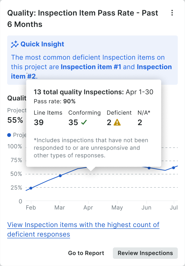 With this enhancement, project teams and company leaders gain actionable data to drive quality initiatives, reduce costly rework, and minimize inspection delays. The insight provides detailed breakdowns and interactive features—such as trend analysis over the last six months, identification of items or projects with the highest deficiency rates, and direct links to detailed reports—making it easier to address quality concerns proactively. Ultimately, this new capability helps you stay ahead of quality issues, streamline workflows, and keep your projects on track.